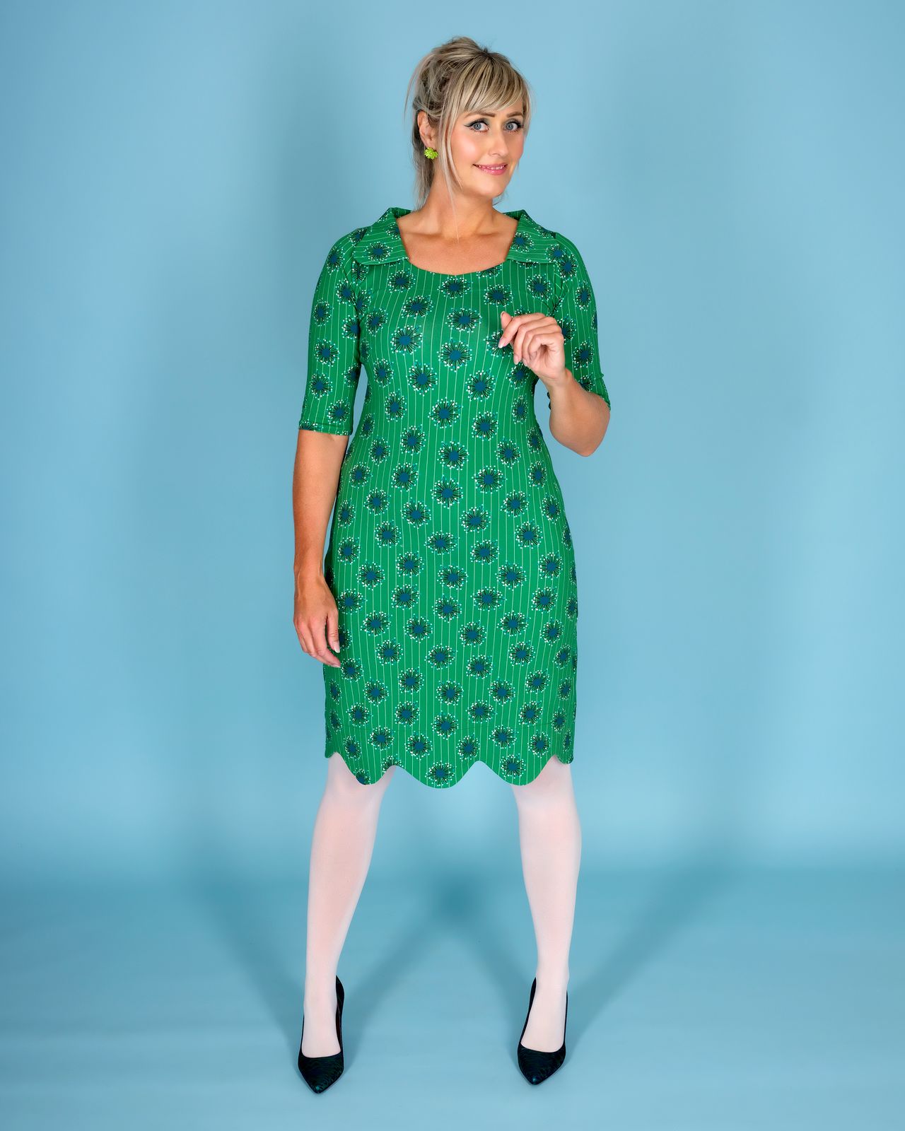 Smukke Latvia er en farverig, tætsiddende kjole med et enkelt og feminint snit. Den har korte ærmer og en rund halsudskæring med bølger, hvilket giver et klassisk og let look.