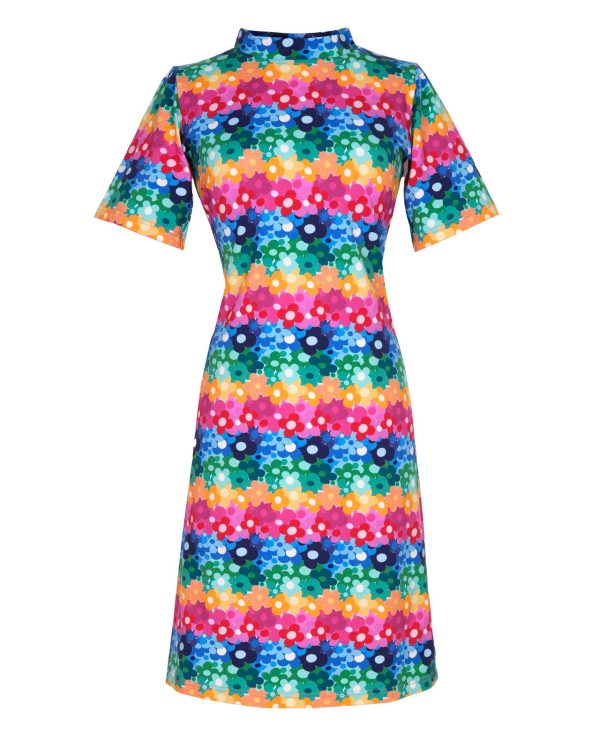 Det mest iøjnefaldende er mønsteret: farverige, blomster i pink, rød, blå, grøn, gul og orange. Farverne er klare og legesyge, næsten retro i udtrykket—lidt 60’er/70’er-vibes 🌈